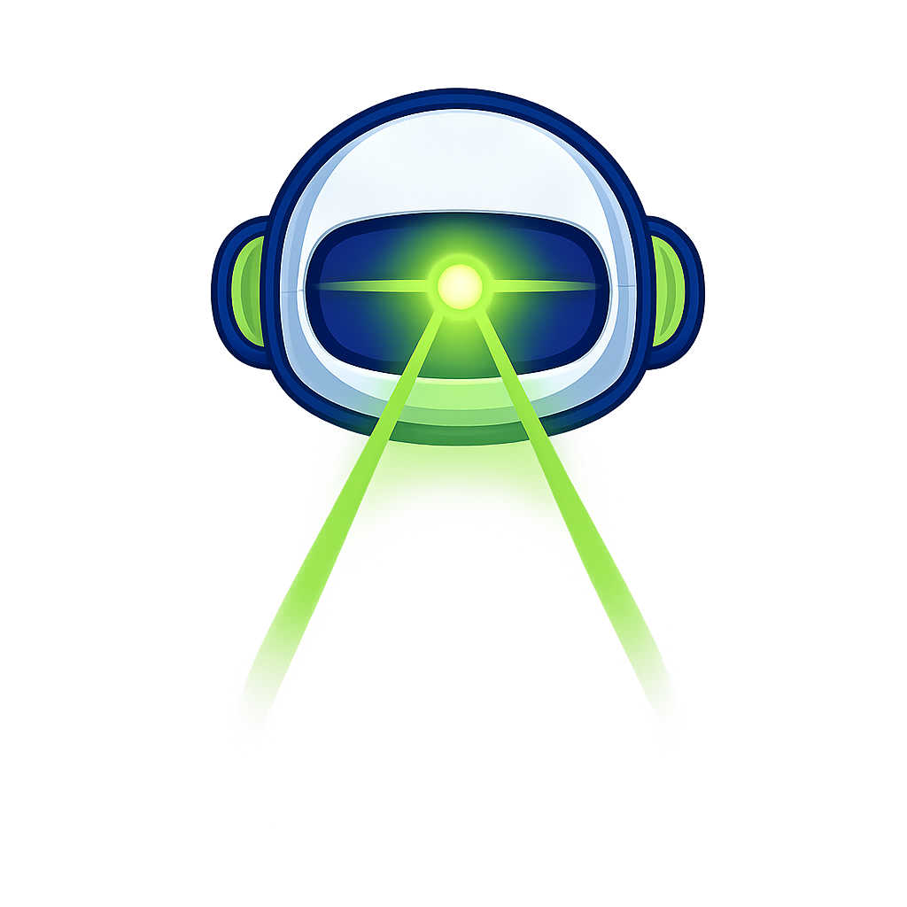 A stylized illustration of a futuristic robot featuring a white helmet and green laser beams emanating from its eyes. The background is softly blurred, enhancing the focus on the robot's design.