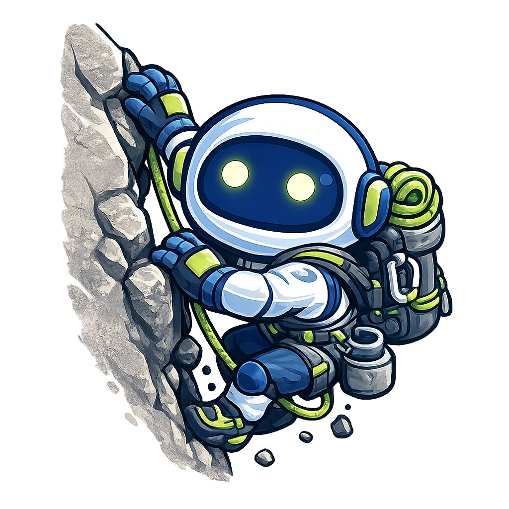 A cartoon-style astronaut is depicted climbing a rocky surface, equipped with climbing gear and a vibrant backpack. The character features glowing eyes and a playful design, set against a dark, atmospheric background.