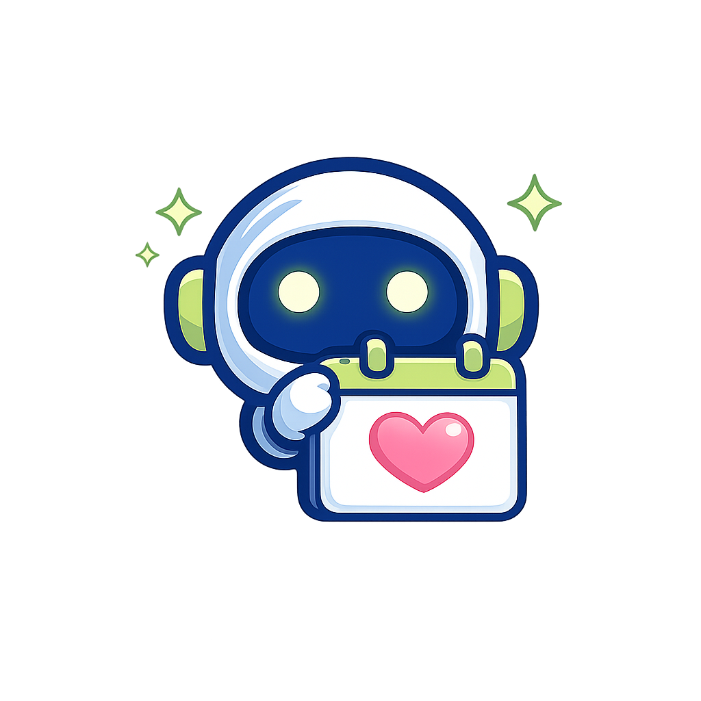 A whimsical robot character with a blue and white color scheme, holding a calendar featuring a heart symbol. The robot has glowing eyes and green accents, giving it a friendly appearance.