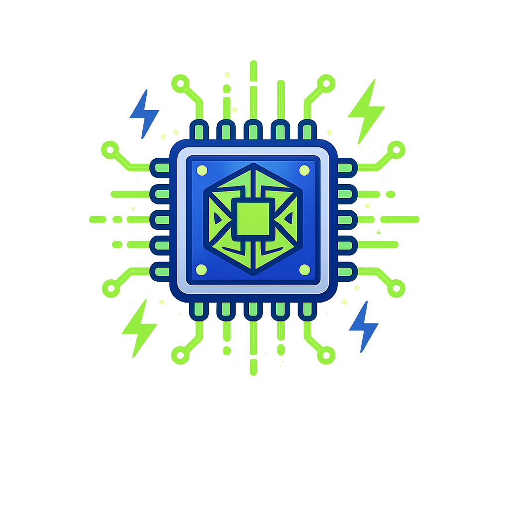 An artistic representation of a microchip, featuring intricate patterns and electric motifs. The background glows in vibrant green, enhancing the tech theme.