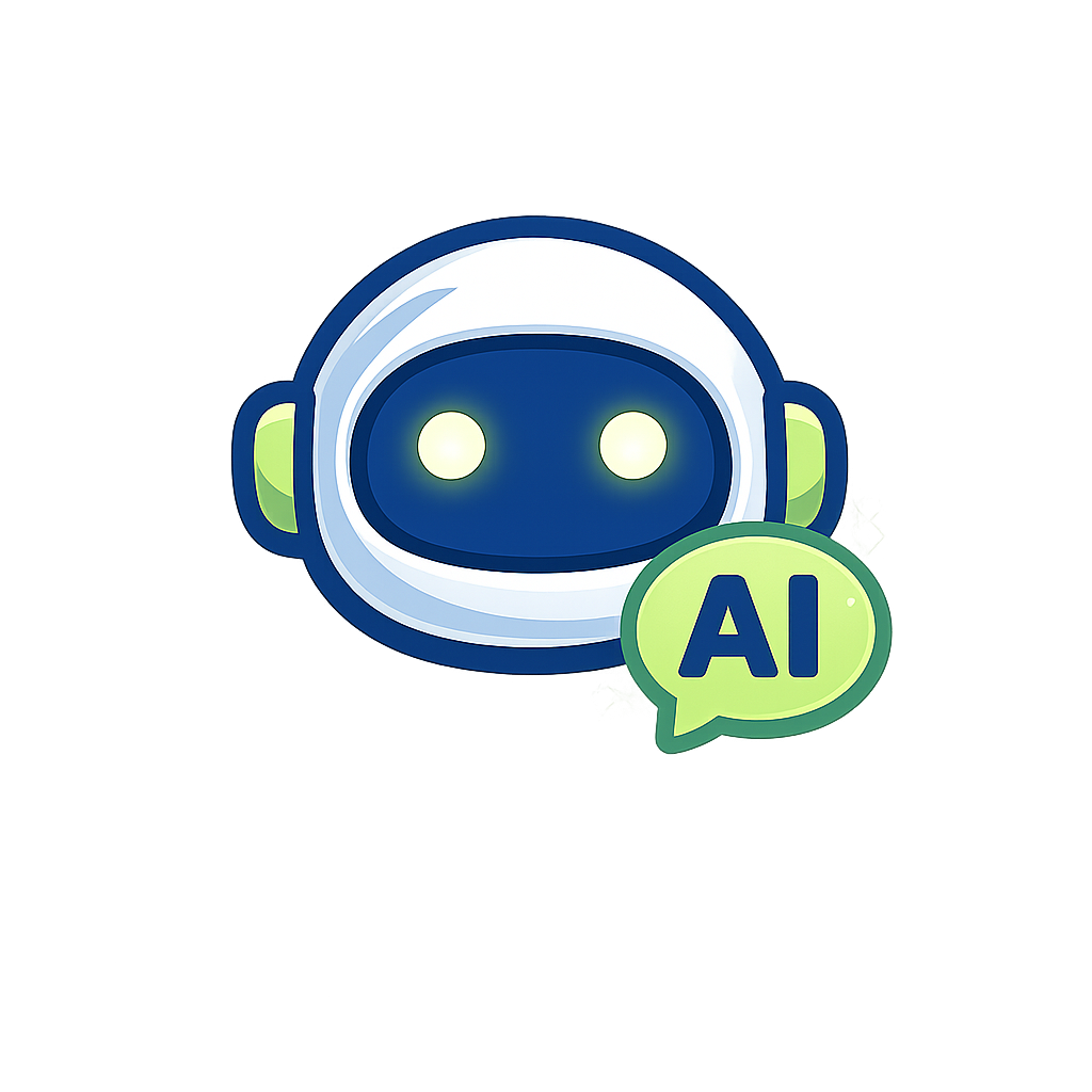 A playful AI robot logo featuring a round head with a white helmet and glowing eyes. It has a chat bubble labeled 'AI,' representing communication and technology.