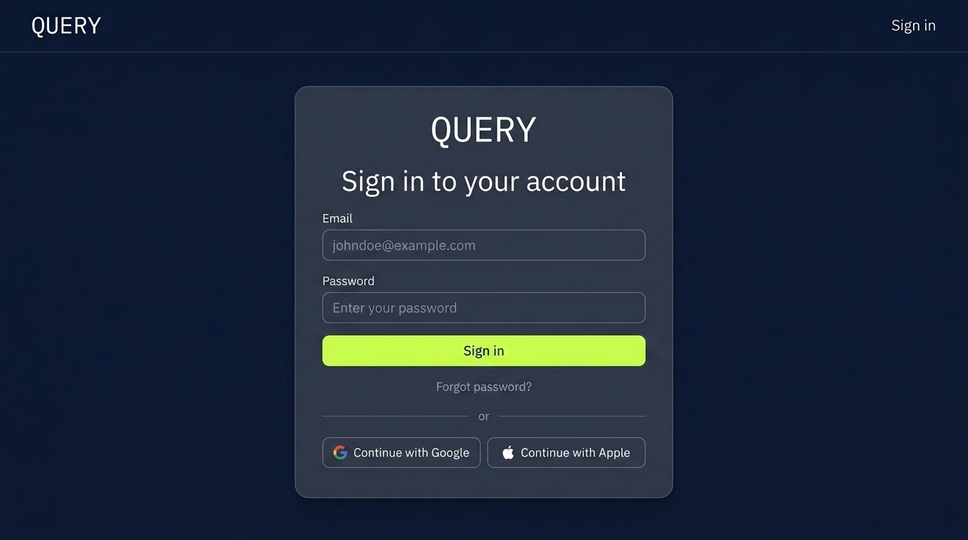 This image shows a login interface for the QUERY application, featuring fields for email and password entry, with options to sign in using Google or Apple.