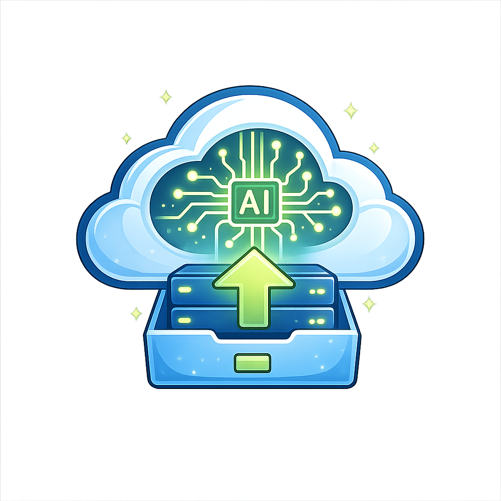 An artistic representation of cloud computing featuring a cloud with AI circuitry, symbolizing data storage and upload concepts in a digital environment.