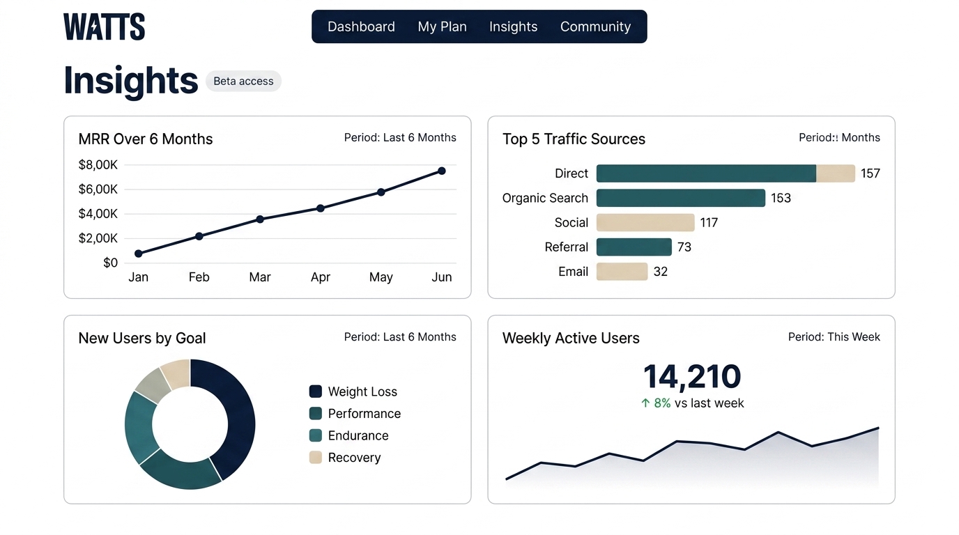 A comprehensive dashboard displaying metrics like MRR, traffic sources, user goals, and active users. Highlights include a line graph for MRR and a pie chart for user goals.