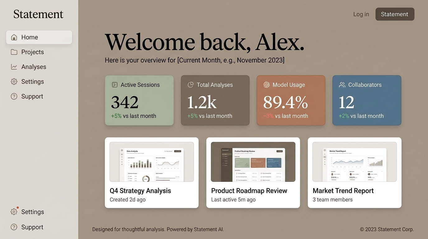 The image displays a user dashboard with analytics metrics, including active sessions, total analyses, model usage, and collaborator statistics for November 2023.