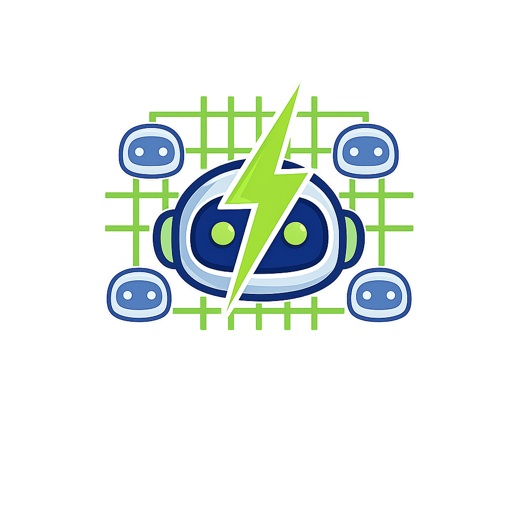 A vibrant robot icon featuring a lightning bolt, surrounded by circular elements on a grid background. The design emphasizes energy and modern technology.