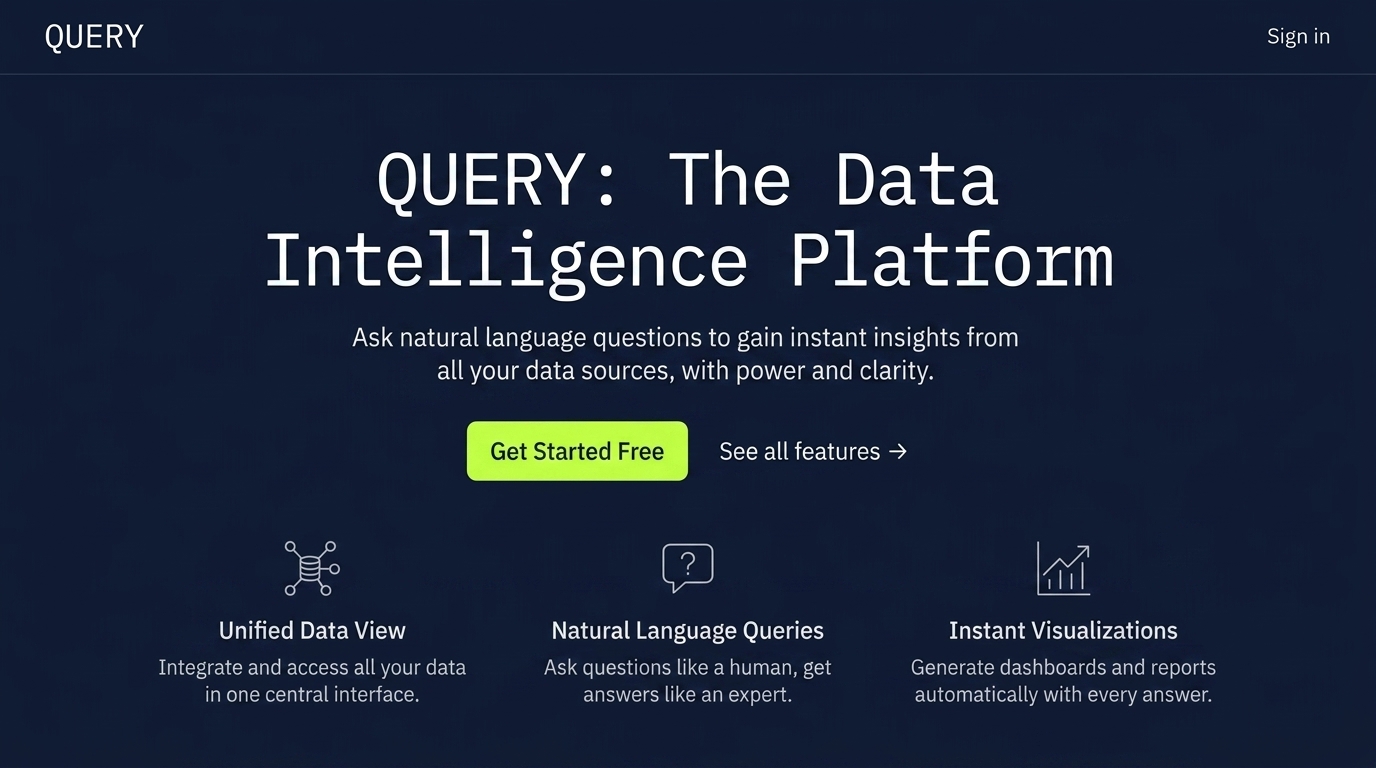 The image features a promotional layout for QUERY, a data intelligence platform designed for natural language queries and data visualization. It highlights features like unified data view and instant insights.