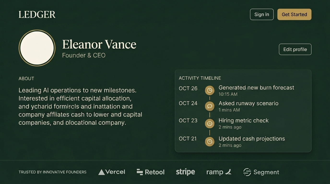 The image presents a profile summary for Eleanor Vance, Founder and CEO of Ledger, detailing her role in leading AI operations and recent activities.