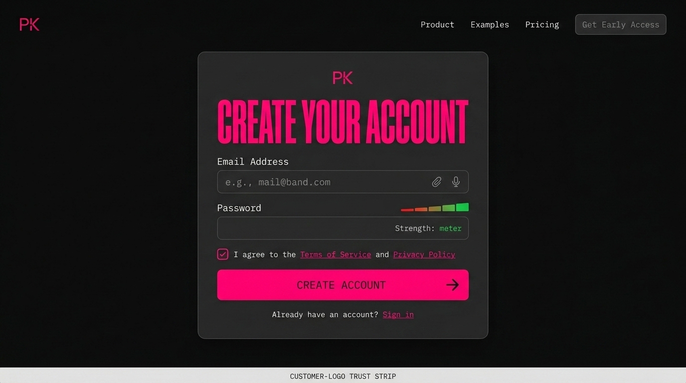 A modern user registration interface featuring bold pink text and input fields on a dark background. It prompts users to enter their email and password, with options for terms and privacy.