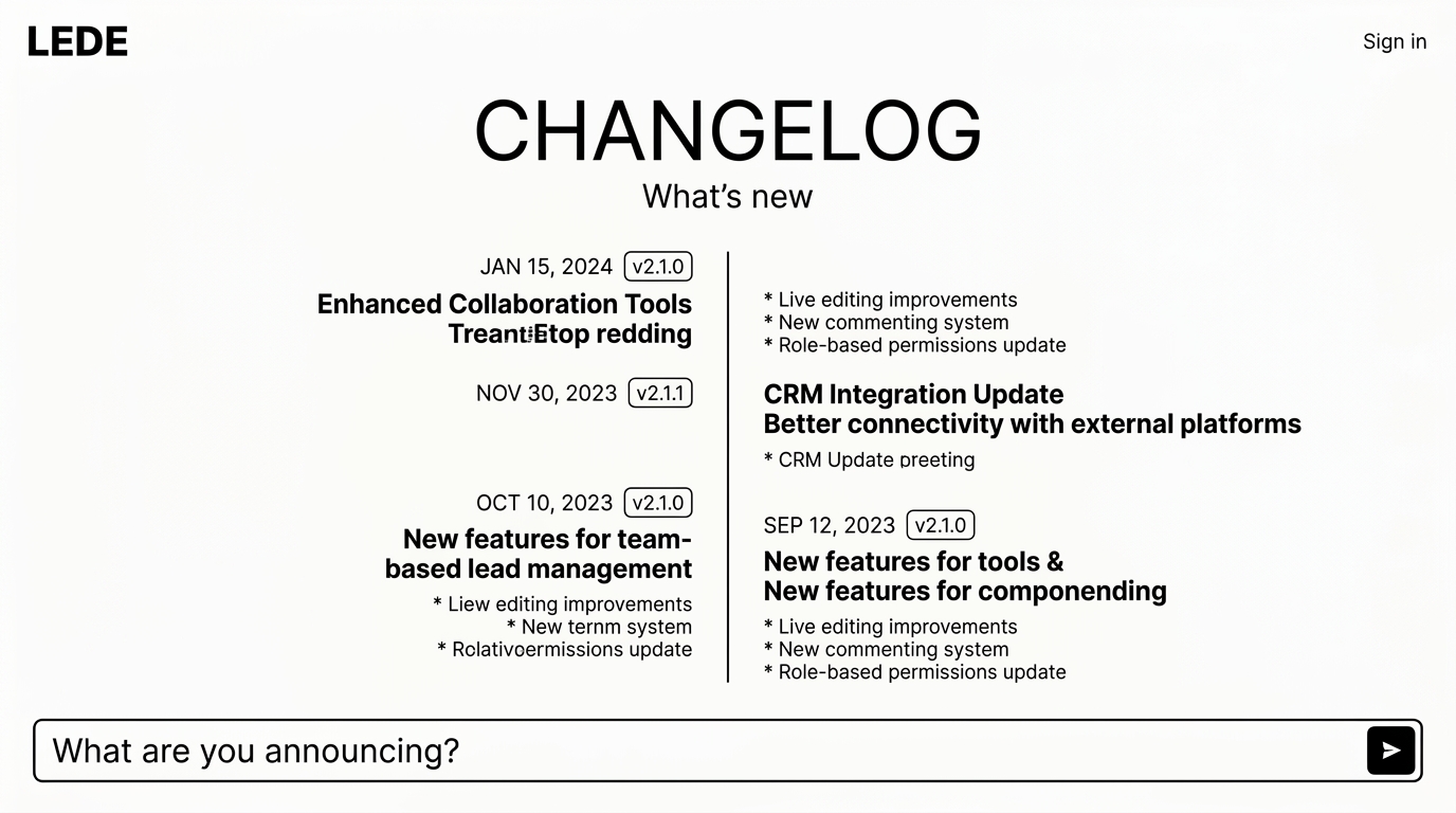 An organized changelog highlighting recent updates, including enhanced collaboration tools and CRM integration improvements, along with new features for team management.