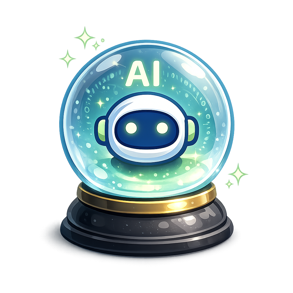 A colorful and enchanting illustration of a snow globe featuring a cute robot with the letters 'AI' inside. The globe is adorned with sparkling effects, enhancing its magical appearance.
