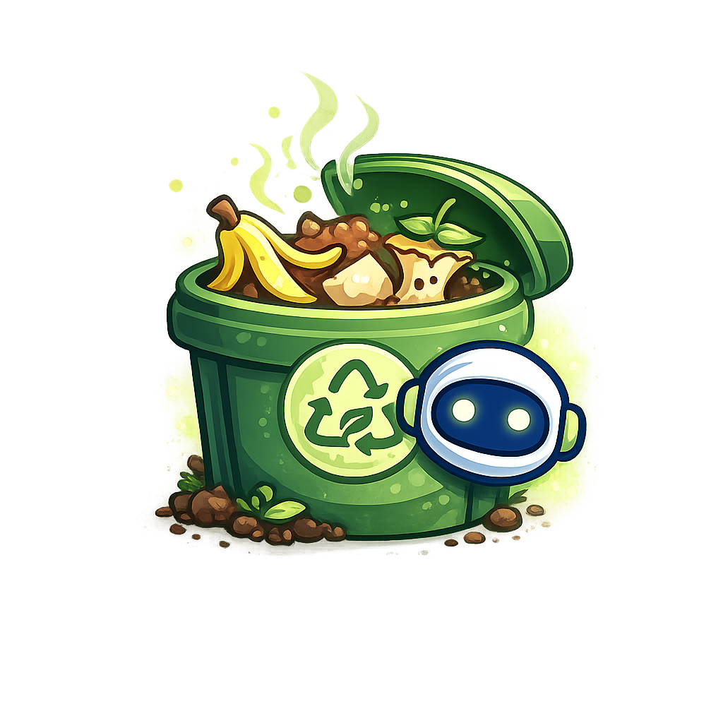 A whimsical cartoon-style compost bin overflowing with organic waste, including banana peels and scraps, accompanied by a friendly robot character. The scene is illuminated with a green glow.