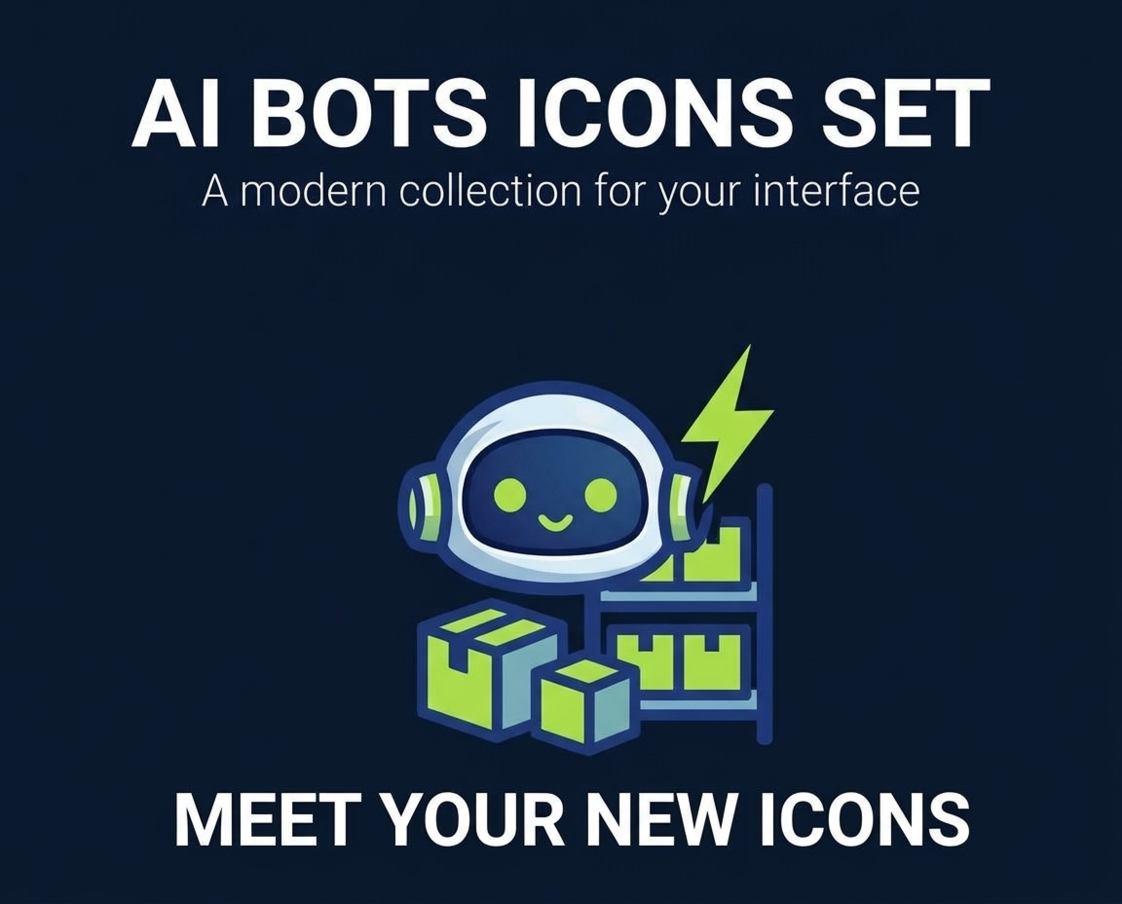 A vibrant collection of AI bot icons designed for modern interface applications, featuring a friendly robot and packaging elements.