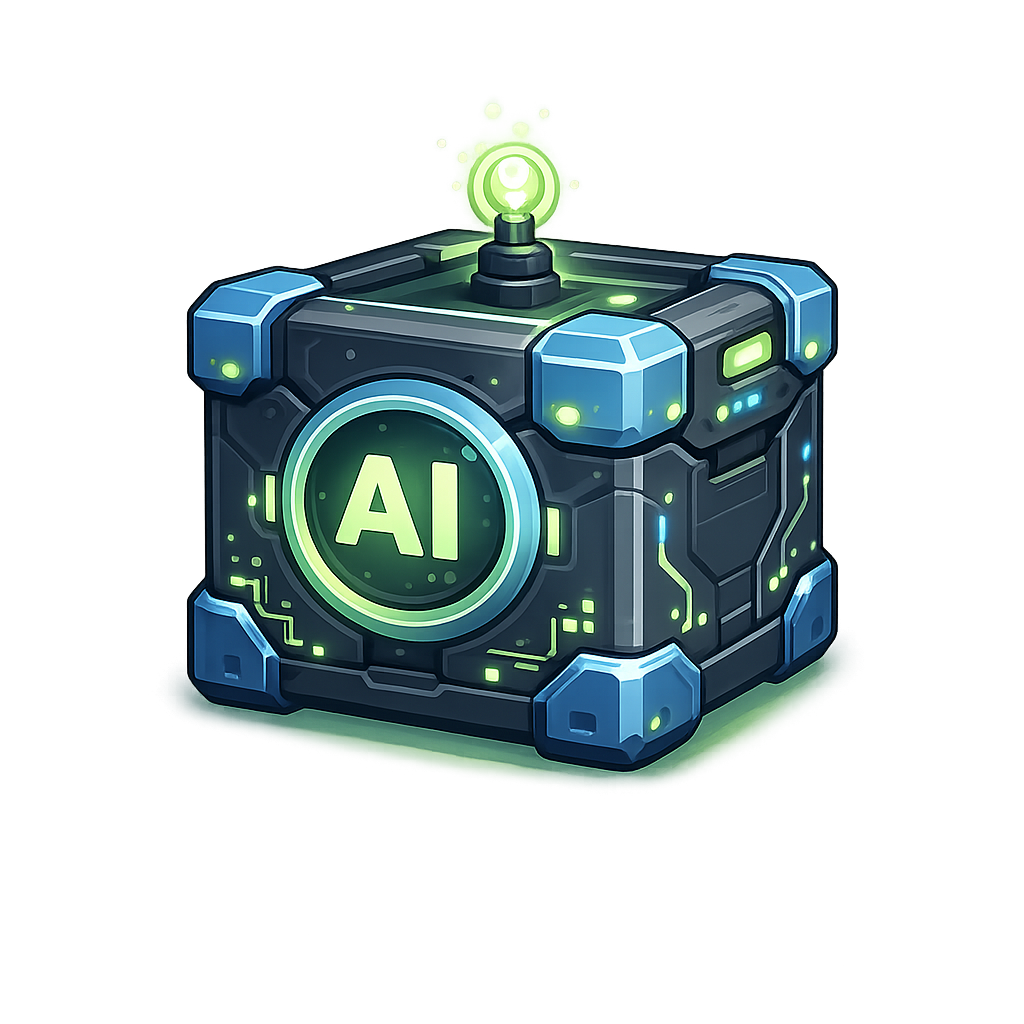 This image features a sleek, futuristic storage box designed with glowing green elements and a prominent 'AI' label. The box appears high-tech, with intricate circuitry patterns and a luminous orb on top, set against a dark background.