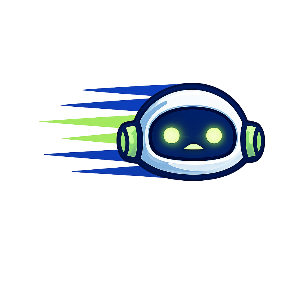 A vibrant cartoon robot character with glowing green and blue accents, depicted in motion with speed lines. The robot features a friendly face and a sleek design.
