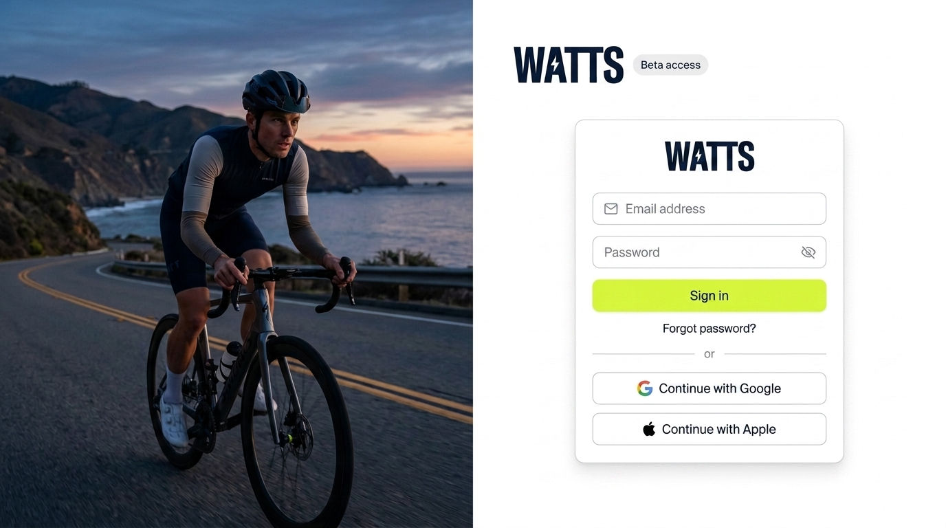 A cyclist dressed in a sleek outfit rides along a winding coastal road during sunset, with mountains and ocean in the background. The scene captures the essence of adventure and sport.