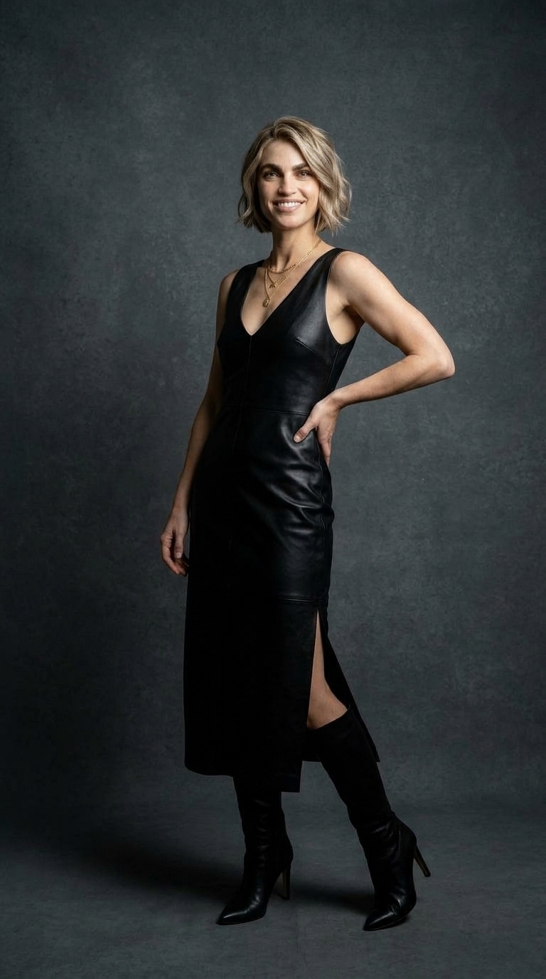 A fashionable woman poses confidently in a sleek black leather dress with a deep V-neckline and high slits. She complements her outfit with knee-high black boots, exuding modern elegance.