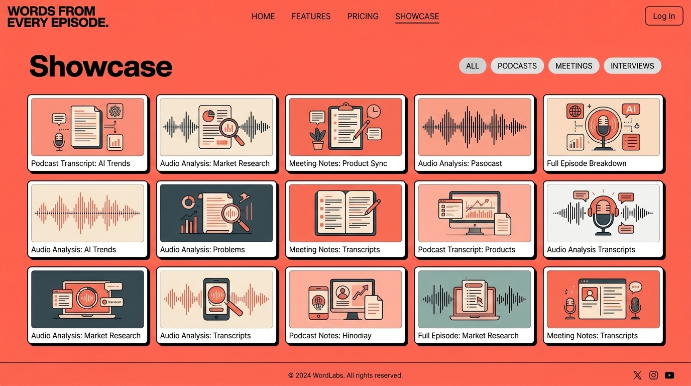 A grid display featuring various podcast and meeting analysis resources, including transcripts and market research notes, organized for easy access.