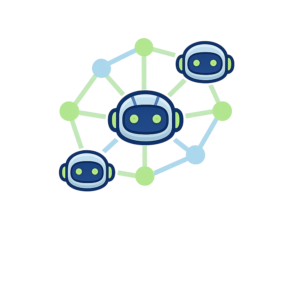 The image features three stylized robots connected by glowing nodes, symbolizing a digital network. The robots are designed with a friendly appearance and a blue-green color palette.
