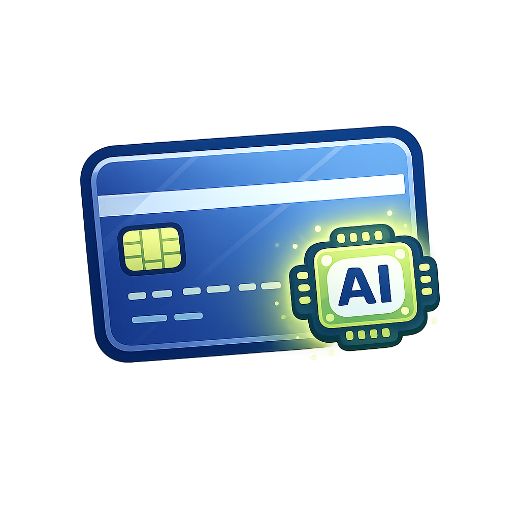 A stylized image of a blue credit card featuring an AI chip. The card design is modern, highlighting technology integration.