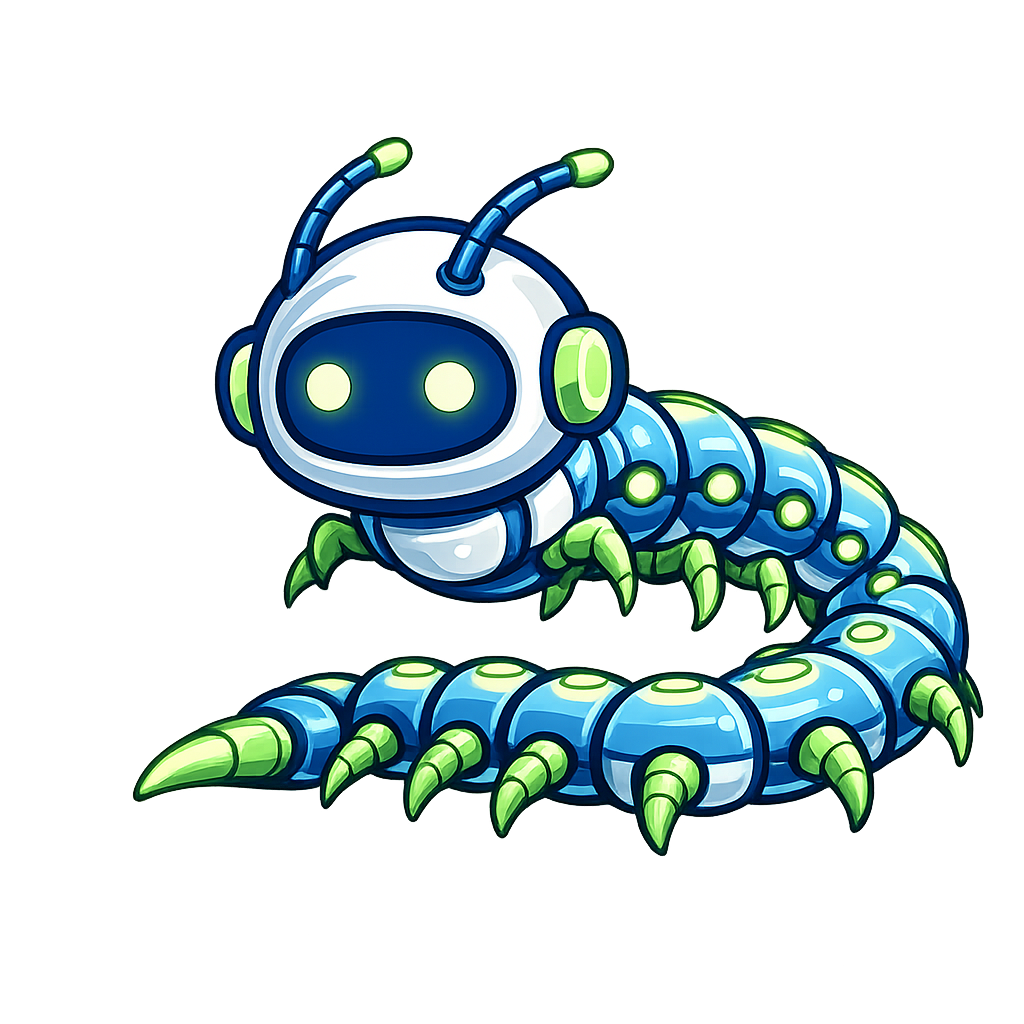 A charming cartoon caterpillar with a robotic design, featuring a round head with large eyes and antennae. Its body is segmented with a vibrant blue and green color scheme, glowing against a dark background.