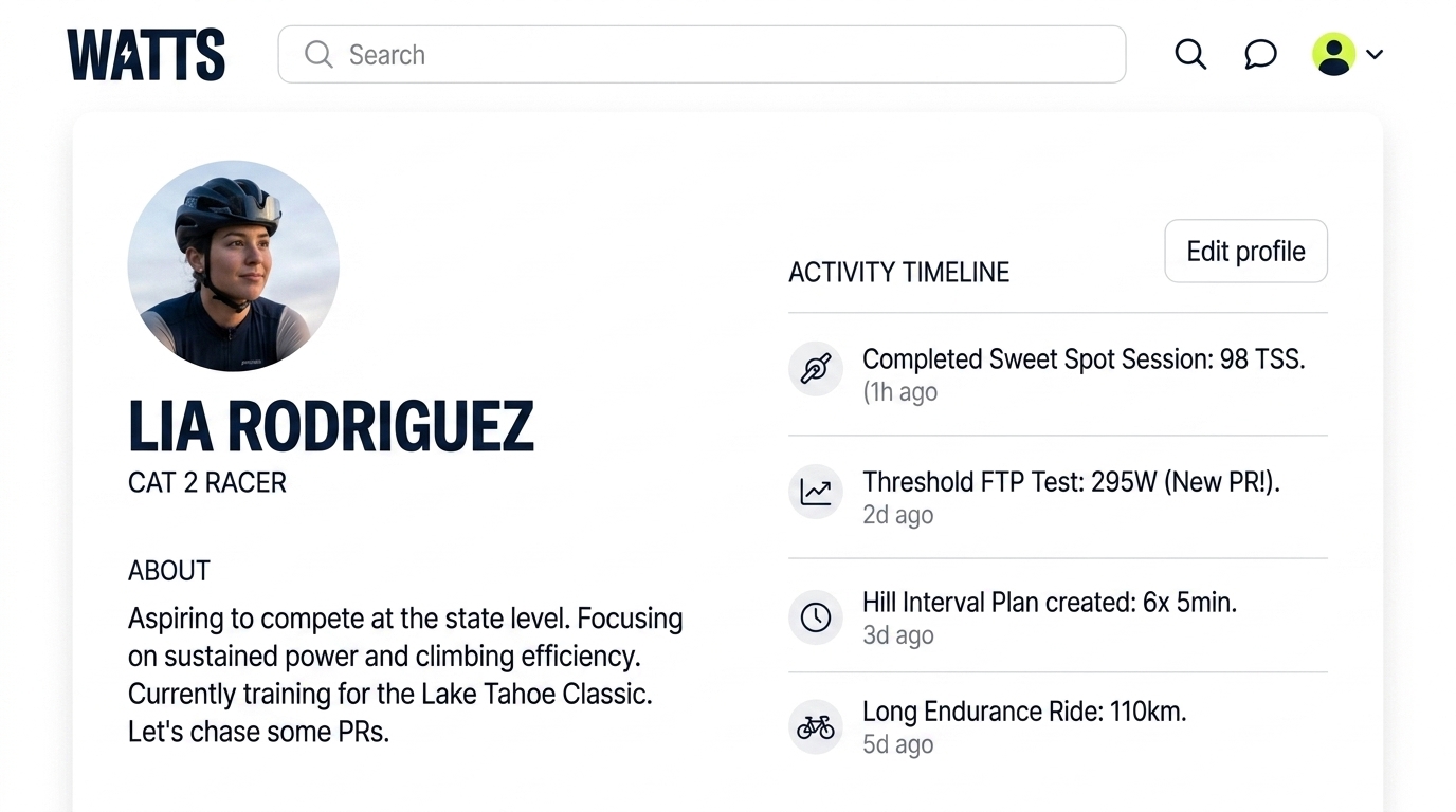 The image showcases the profile of Lia Rodriguez, a Cat 2 racer. It highlights her training focus and recent activities, including rides and fitness tests.