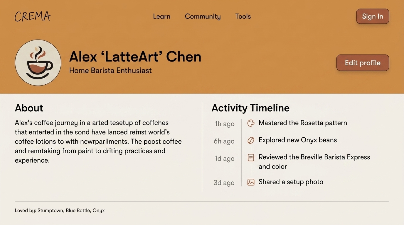 This image features a user profile for Alex 'LatteArt' Chen, a home barista enthusiast, showcasing his coffee journey and activities in the coffee community.