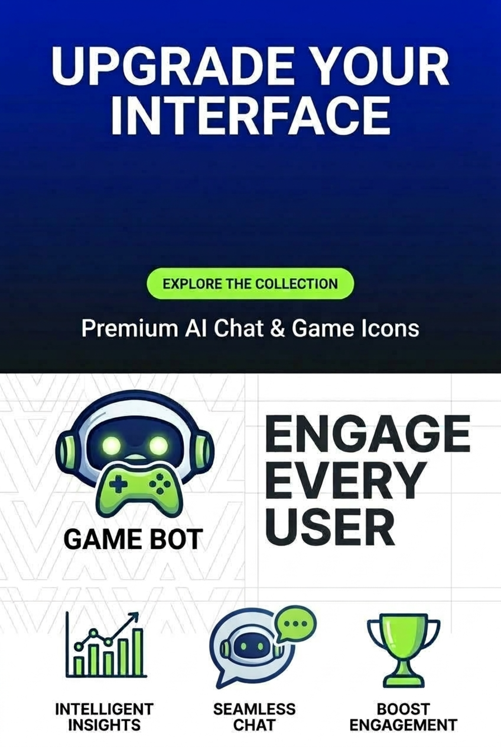 Promotional graphic showcasing premium AI chat and game icon designs. Highlights features like intelligent insights and user engagement.