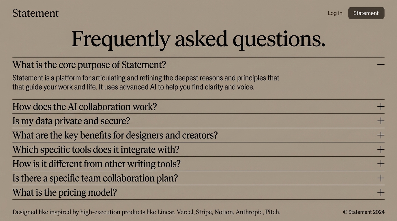 This image showcases a Frequently Asked Questions section for the Statement platform, focusing on AI collaboration, data security, and integration with design tools.