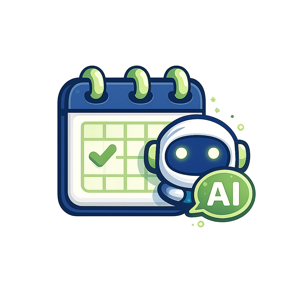 A vibrant illustration featuring a calendar with a checkmark and a friendly robot character holding a speech bubble labeled 'AI'. The design combines elements of technology and organization.