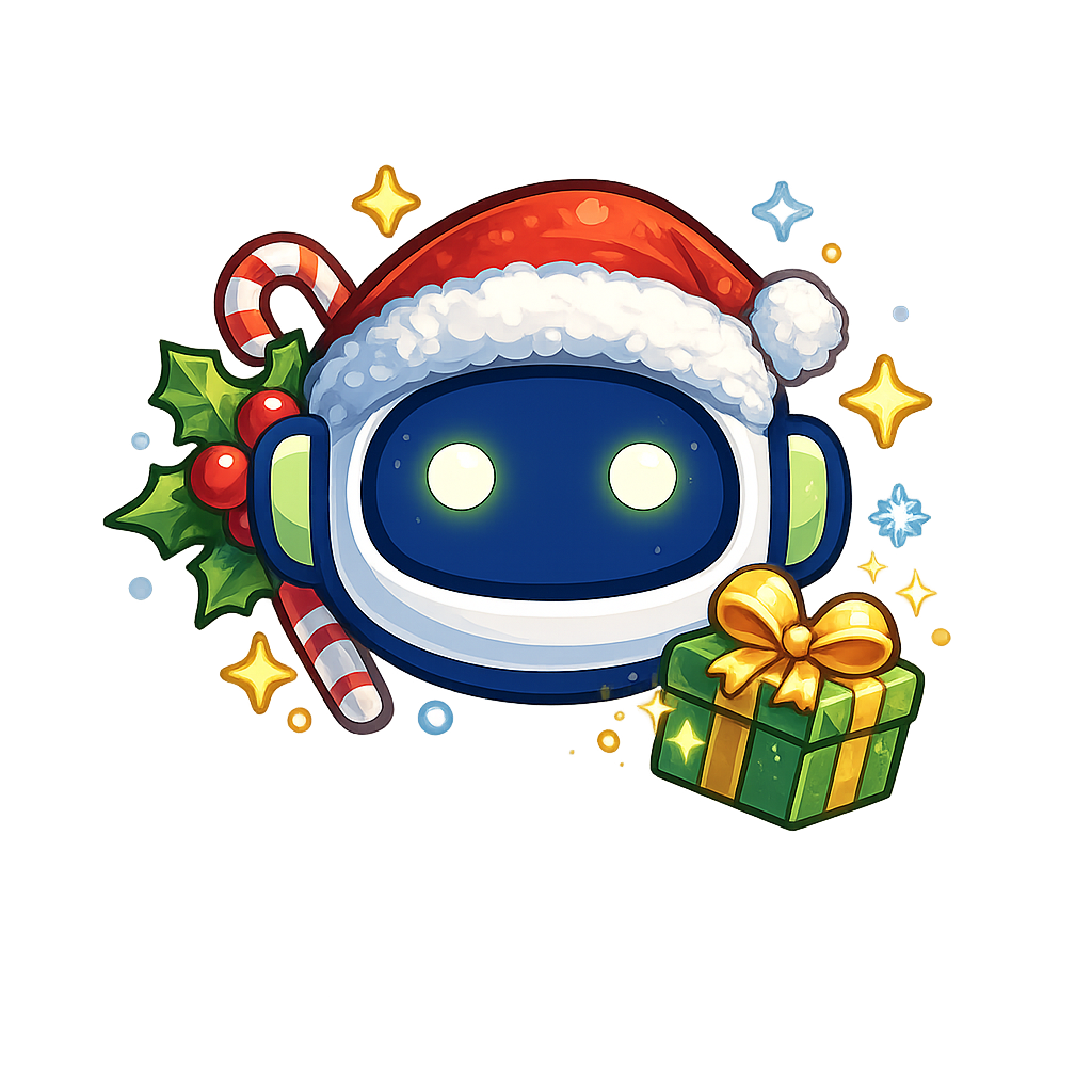 A cheerful robot character wearing a Santa hat and a fluffy white scarf, holding a green gift box adorned with a golden ribbon, surrounded by Christmas decorations.