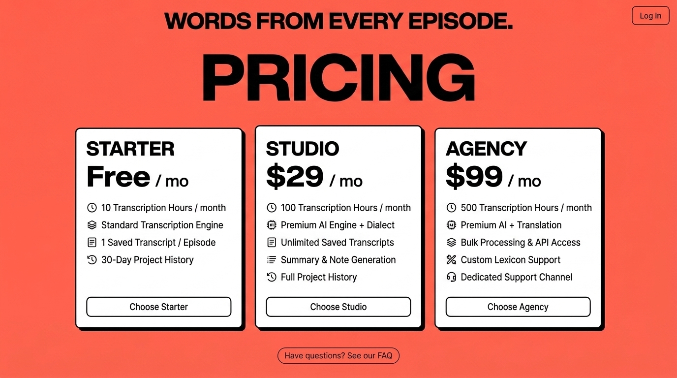 This image displays three pricing tiers for transcription services: Starter, Studio, and Agency, each with different features and monthly costs.