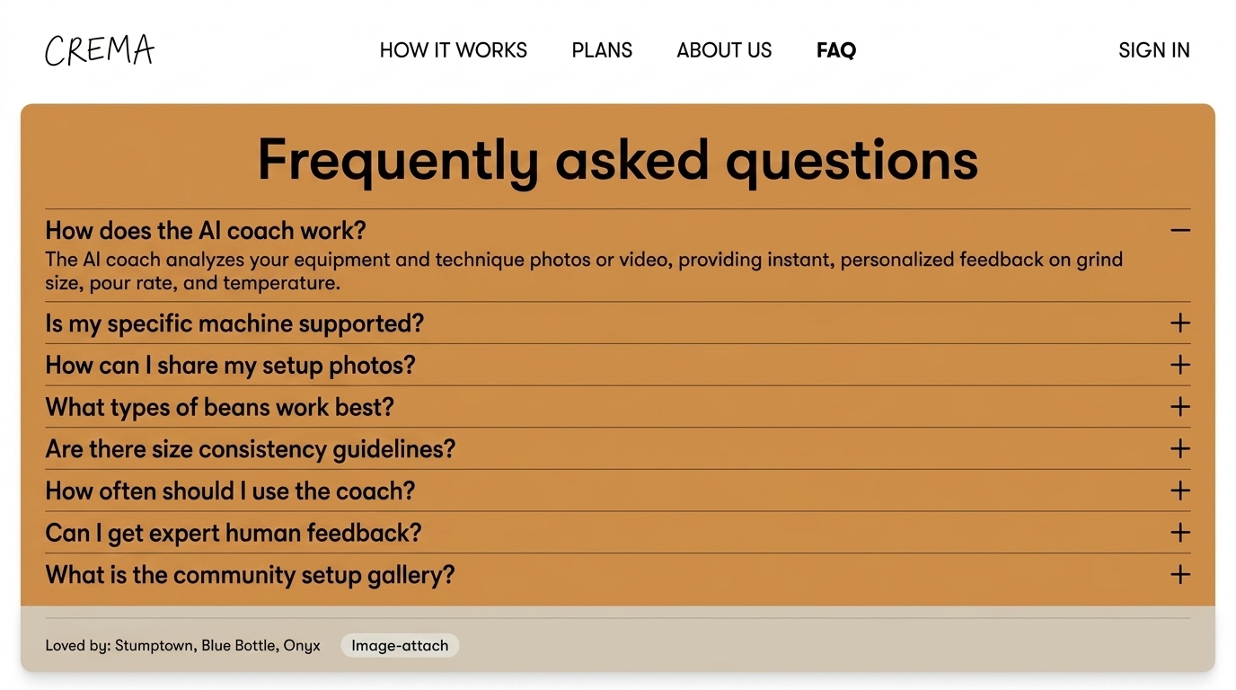 This image features a FAQ section from the Crema website, detailing questions about the AI coach's functionality, photo sharing, and feedback processes.