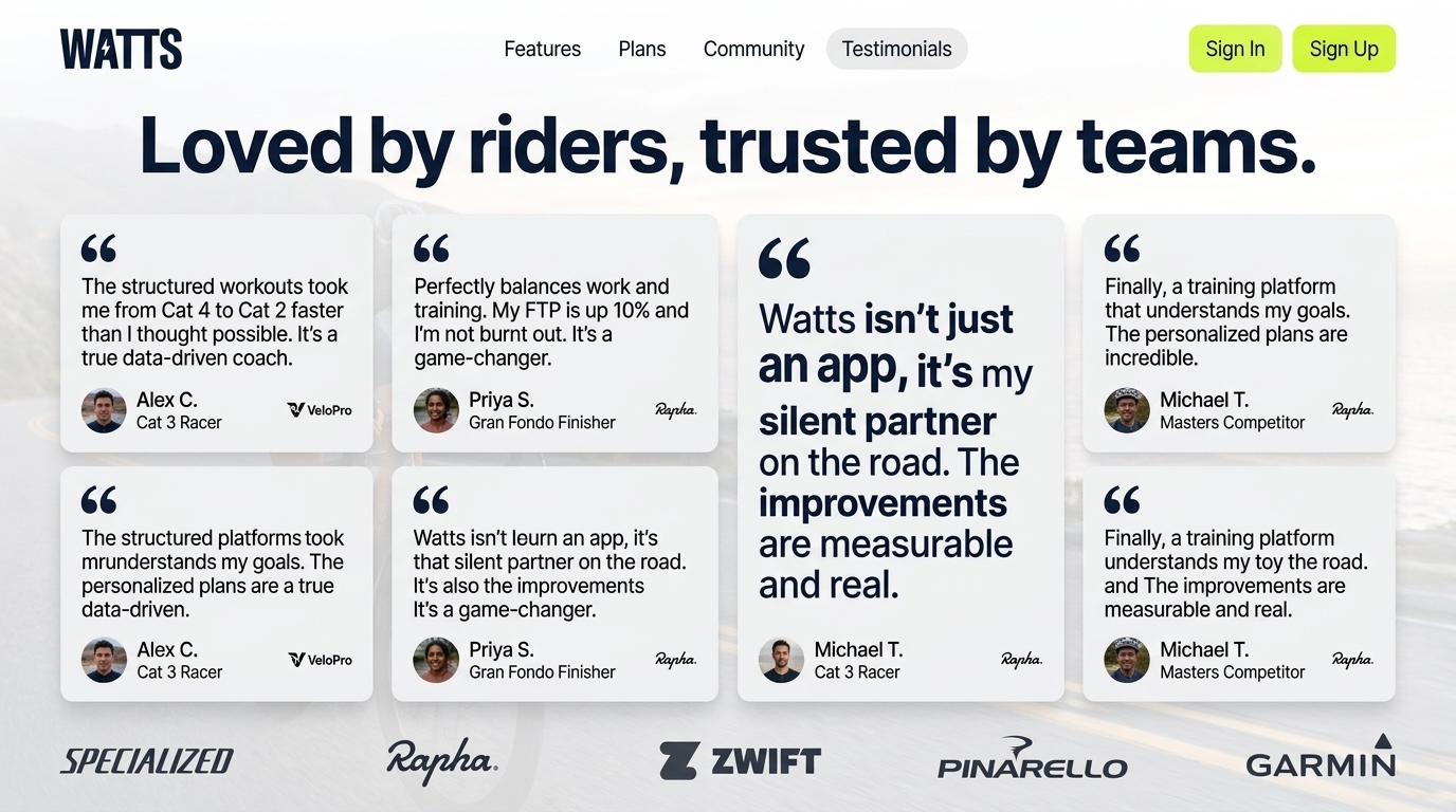 The image features testimonials from various athletes praising Watts for its structured workouts and measurable improvements, showcasing its effectiveness for cyclists.