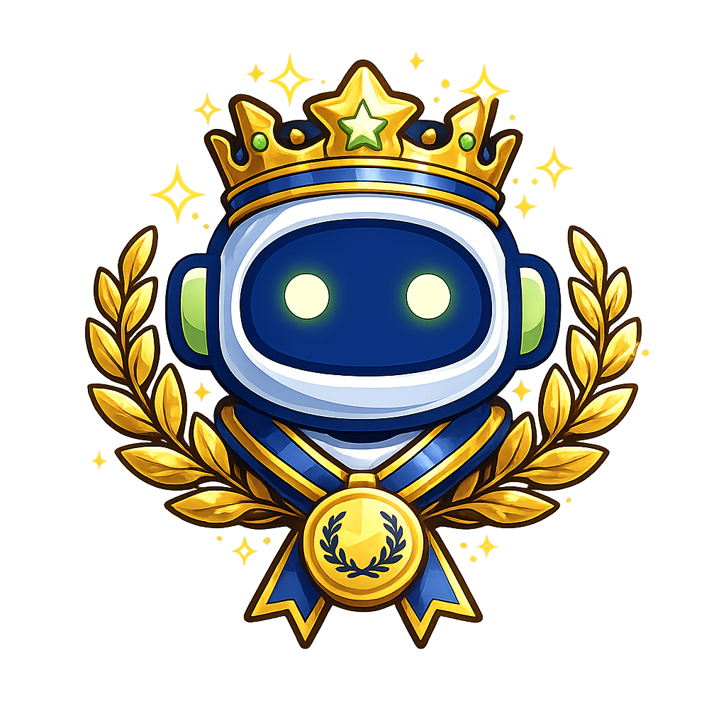 A charming robot character adorned with a crown and surrounded by a laurel wreath, exuding a regal vibe. The background features a sparkling golden hue, enhancing the robot's celebratory appearance.