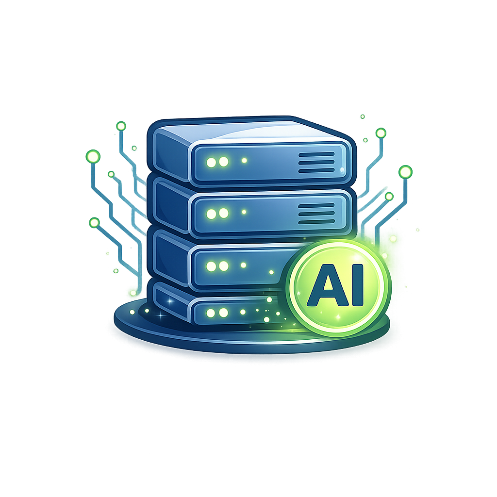 A vibrant illustration featuring stacked servers emitting green digital signals, symbolizing artificial intelligence technology. The design highlights connectivity and innovation.