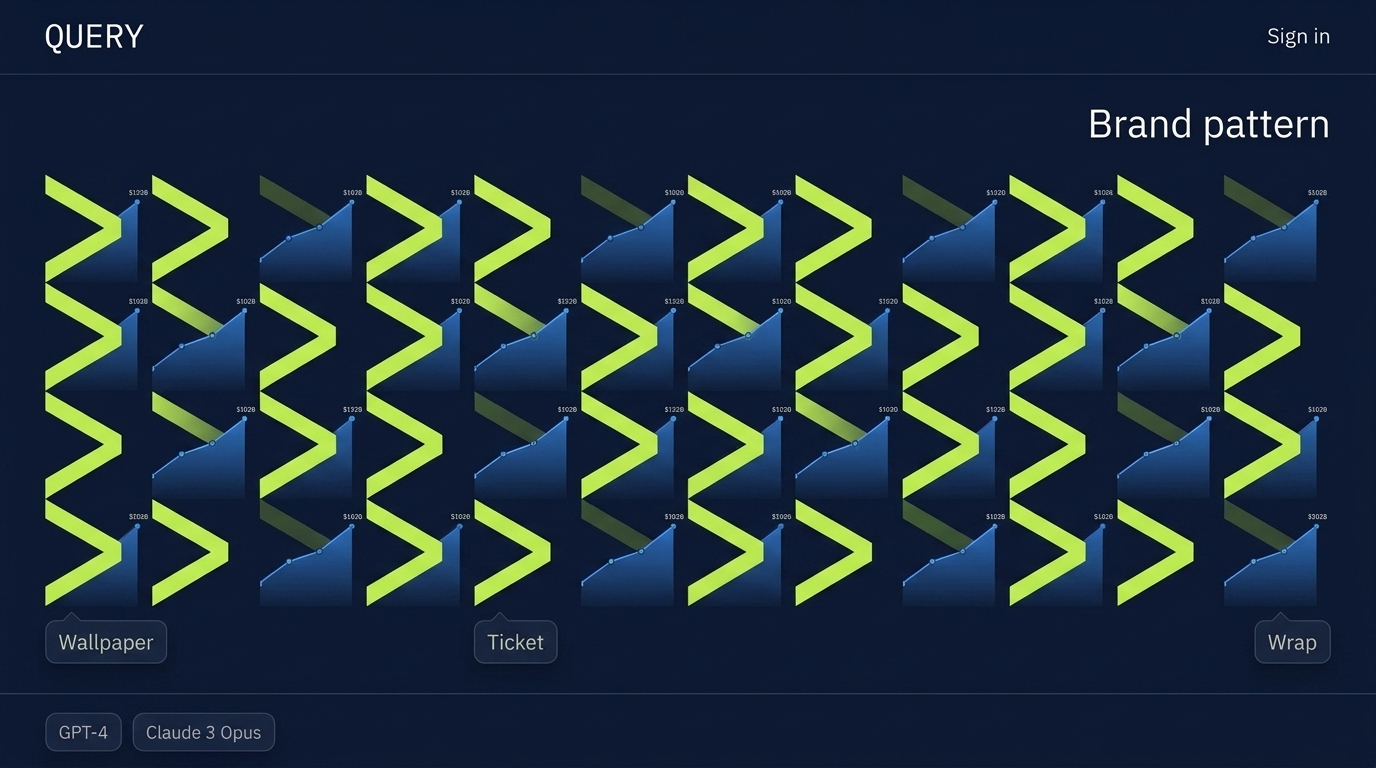 This image features a modern brand pattern showcasing geometric shapes in vibrant blue and neon yellow colors. The design includes various elements labeled as wallpaper, ticket, and wrap, illustrating versatility.