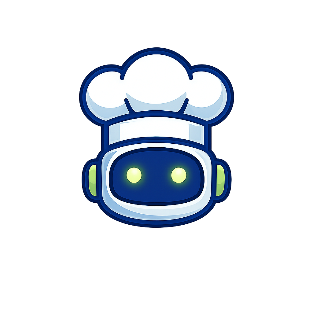 A whimsical cartoon-style robot character wearing a chef's hat. The robot features bright green ears and glowing eyes, set against a soft gray background.