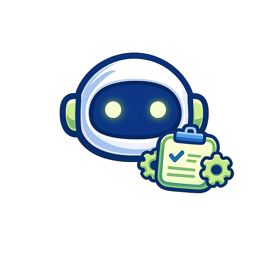 A cartoonish robot character with a friendly face, holding a checklist and gears. The design features bright colors and a glowing effect, representing technology and organization.