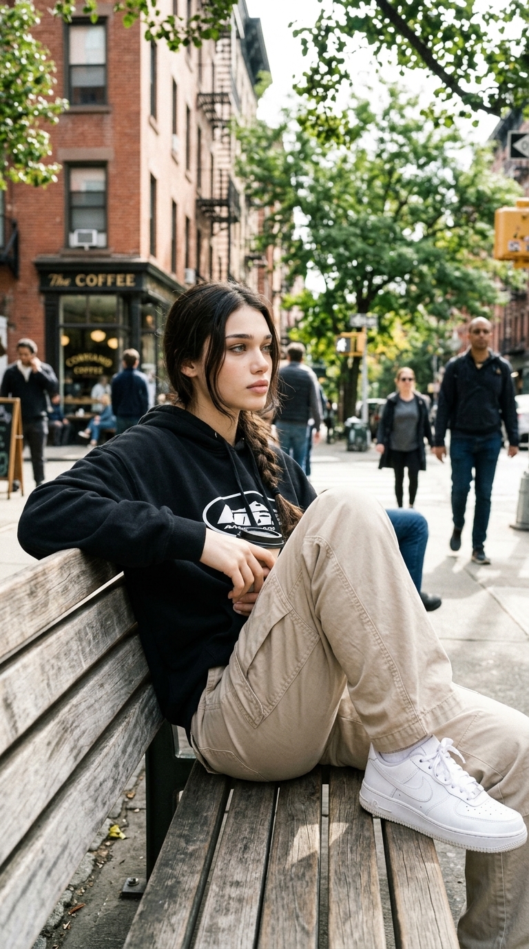 A young woman sits on a park bench in a bustling urban street, wearing a black hoodie and beige pants, showcasing a relaxed attitude amidst city life.