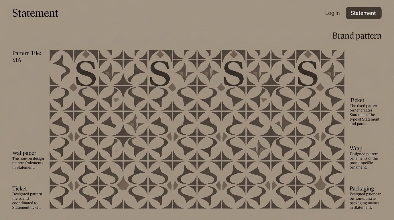 This image showcases a sophisticated brand pattern featuring a repeating 'S' motif. The design includes various sections labeled for different applications like wallpaper, tickets, and packaging.