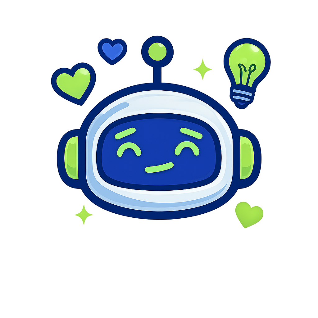 A vibrant and playful illustration of a smiling robot with a light bulb and hearts around it, symbolizing creativity and affection. The design features bright colors and a friendly expression.