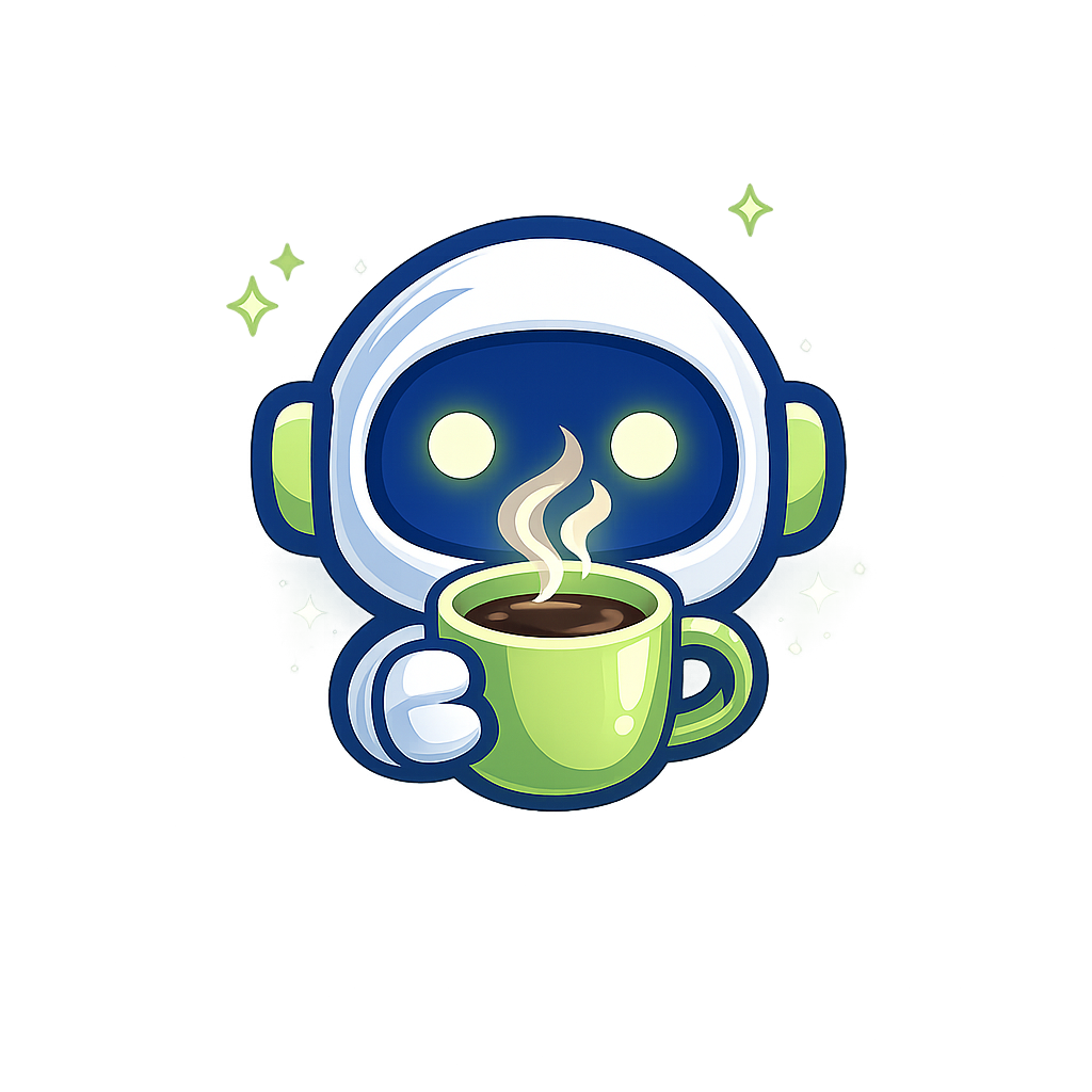 A charming robot character with a blue and white design, holding a green coffee cup with steam rising. The background features a subtle glow, adding a whimsical touch.