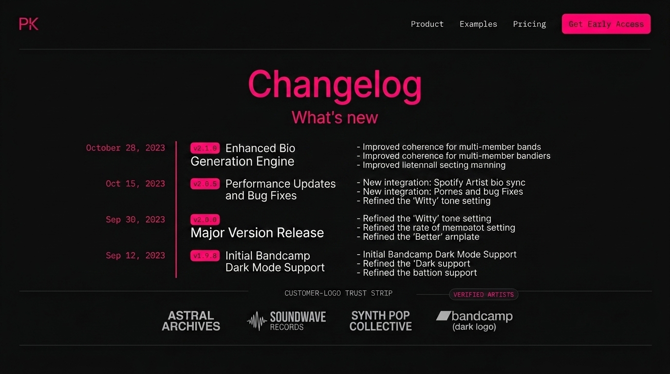A detailed changelog showing recent updates for the PK product, including enhancements, bug fixes, and support additions. Key dates highlight major releases.