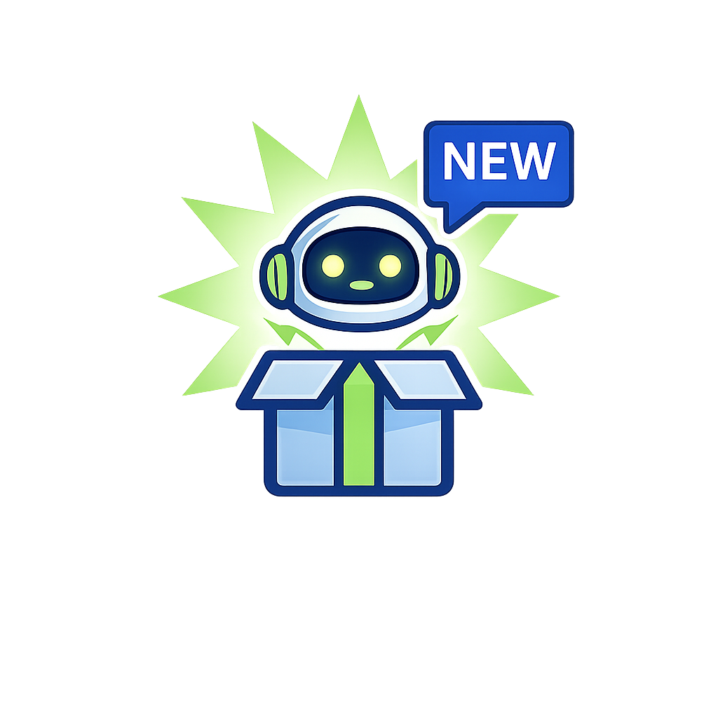 A vibrant icon featuring a cute robot emerging from a gift box with a 'NEW' notification. The design uses bright colors, emphasizing the excitement of new features.