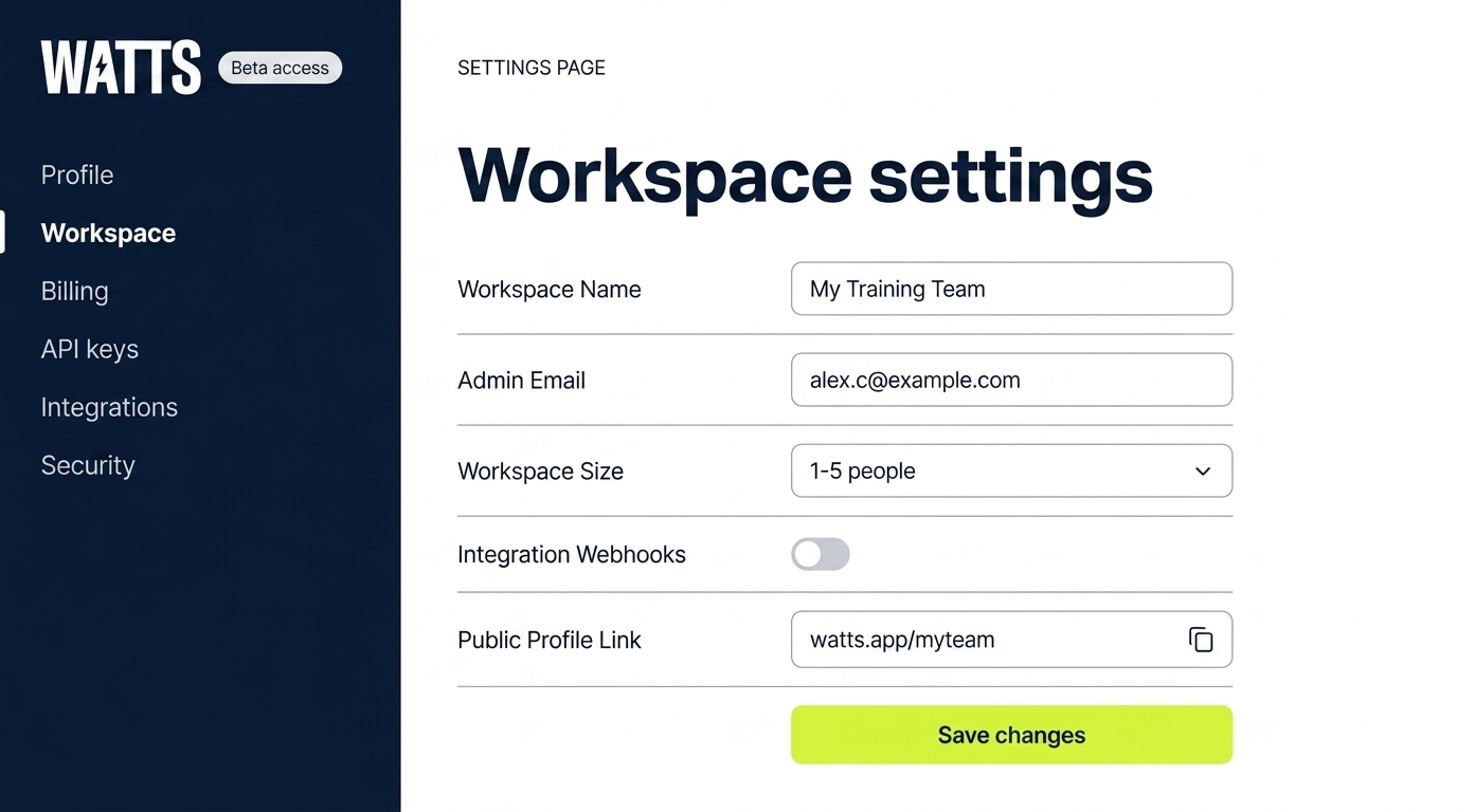 A user interface showing workspace settings for a team, including admin email, size options, and integration webhooks.