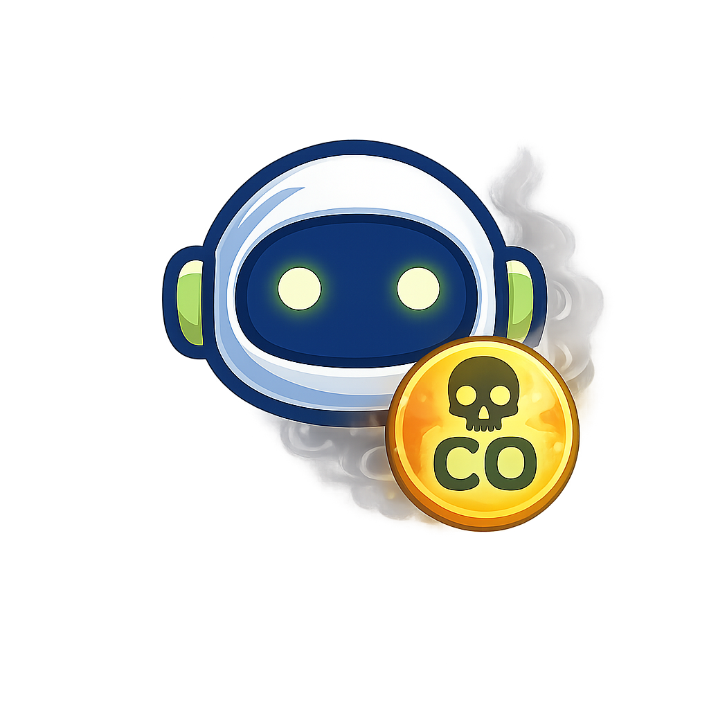 A stylized robot with a blue and white design featuring glowing eyes, accompanied by a yellow circular coin with a skull symbol, representing toxicity. The background has a smoky effect.