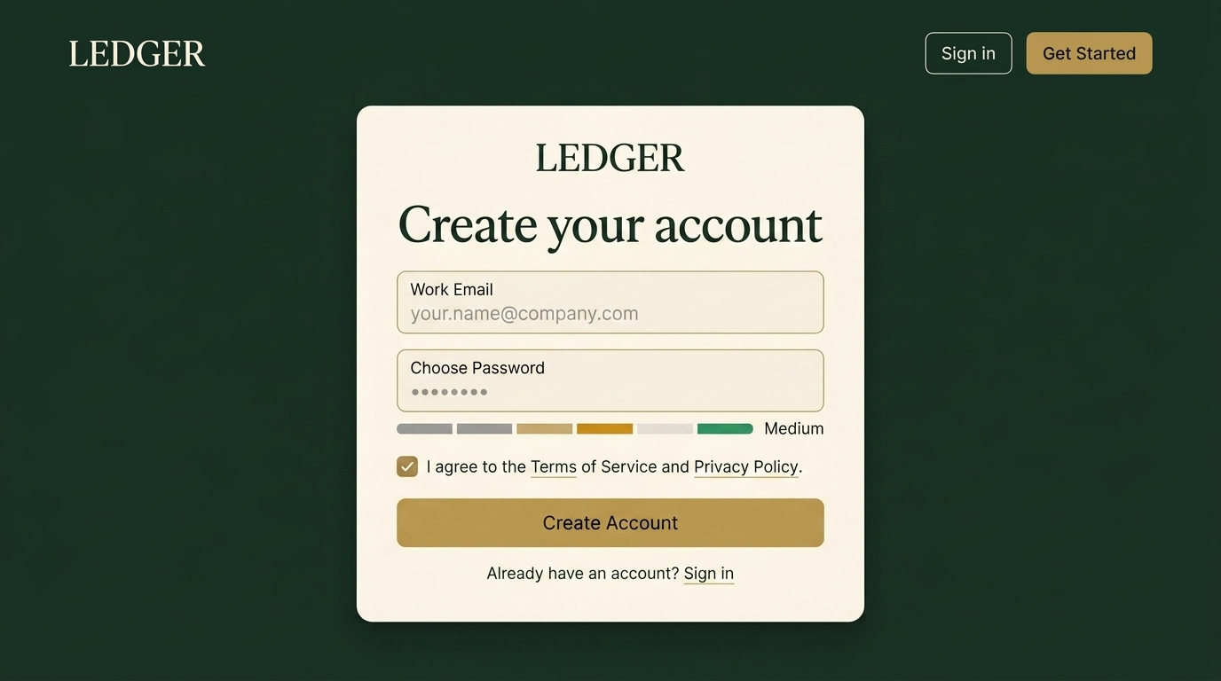 This image displays the account creation interface for Ledger, featuring fields for work email and password selection, along with terms and privacy policy agreement.