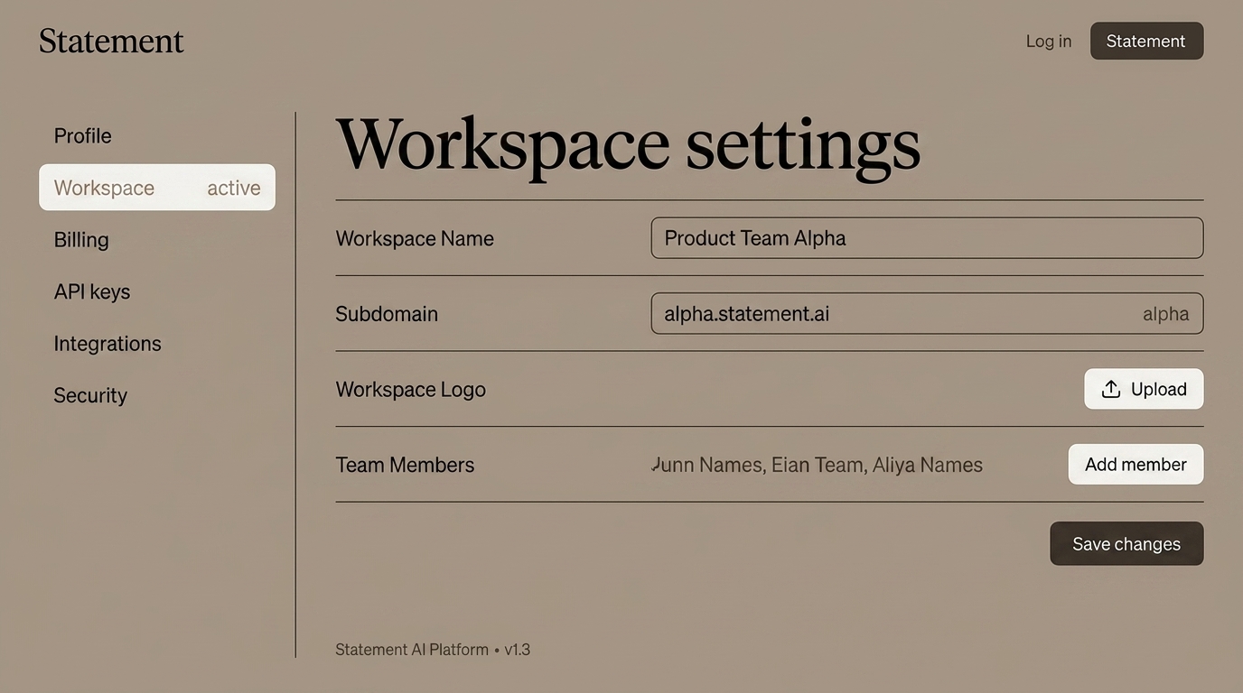 The image displays a user interface for workspace settings, featuring options for workspace name, subdomain, logo upload, and team member management.