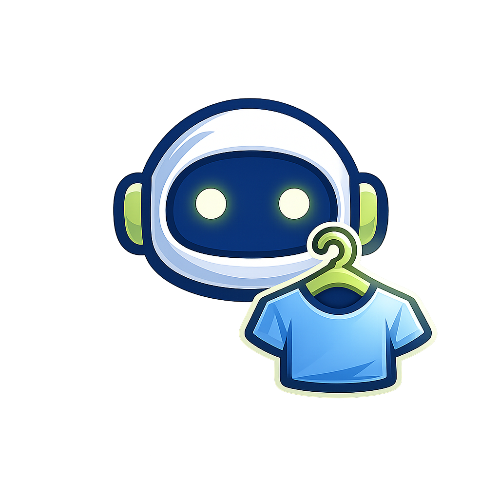 A charming robot character with blue accents, featuring big eyes. It holds a glowing clothing hanger with a light blue shirt. The background is a soft gray, enhancing the robot's vibrant colors.
